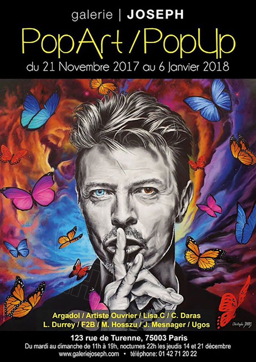 Original poster for the exhibition Pop Art / Pop Up at Galerie Joseph in Paris. The portrait of David Bowie is illustrated by the artist Peintre Christophe Daras for the official poster. The artists exhibited are Argadol / Worker Artist /Lisa. C/ Christophe Daras / L. Durrey / F2B / M. Hosszu / J. M ... (Full description below)