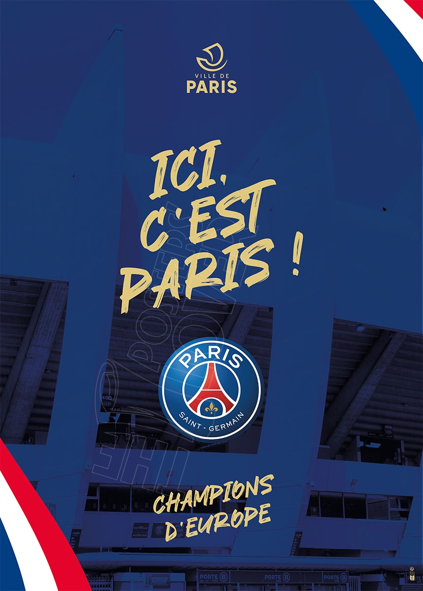 Série de 3 projets d'affiches originales non commercialisée pour la célébration de la victoire du PSG en tant que champion d'Europe 2025 "ICI C'EST PARIS". Les visuels mettent en scène le Parc des Princes, la Tout Eiffel et le Trophée.